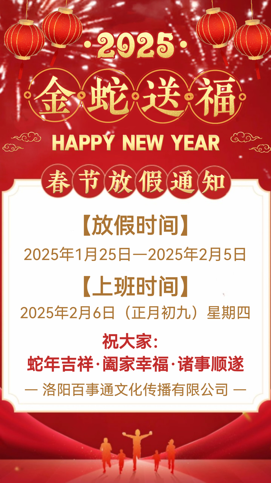 洛陽百事通文化傳播有限公司關(guān)于2025年春節(jié)放假通知